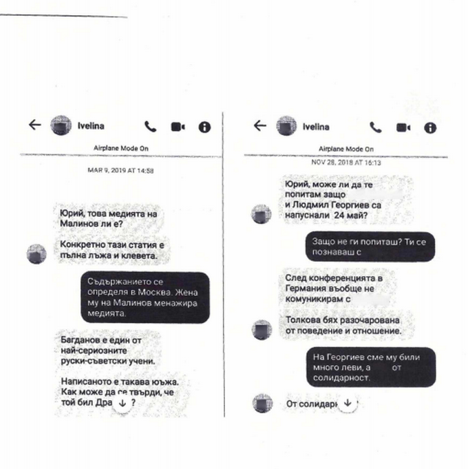 Първият пуснат до медиите файл представлява експертиза на мобилен телефон, по който потребителят Yuri Borissov (известният ляв интелектуалец бе привикан и разпитан като свидетел, б.р.) разговаря с неустановена жена Ivelina. Когато тя го пита: "Юрий, това медията на Малинов ли е", защото имало статия, пълна с лъжи и клевети, той отговаря: