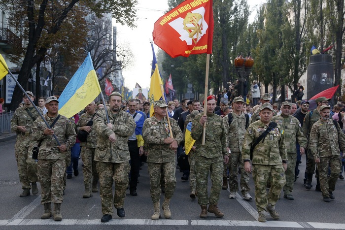 По данни на Франс прес участниците в следобедния протест са най-малко 7000, предимно ветерани от войната в източните части на страната и членове на паравоенни организации. Те развяваха украински и националистически знамена и носеха плакати с лозунги като "Долу предателите" и "Слава на Украйна".