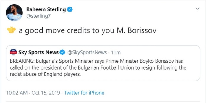 Медиите отразяват призива на Бойко Борисов, а винаги ангажираният по отношение на темата с расизма национал и звезда на "Манчестър Сити" Рахим Стърлинг, не пропусна да реагира в туитър: