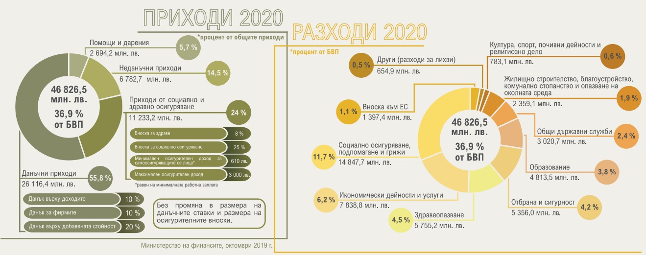 Накратко - МФ планира да събере и изхарчи общо 46,8 млрд. лв. през 2020 г. Увеличението на прихода спрямо тази година се равнява на около 3,3 млрд. лв., които би трябвало да дойдат от повишените постъпления от данъци и осигуровки, както и от добрите прогнози за ръст на икономиката. Планираният държавен дълг бележи двоен ръст спрямо предходните две години и ще достигне до нови 2,2 млрд. лв.