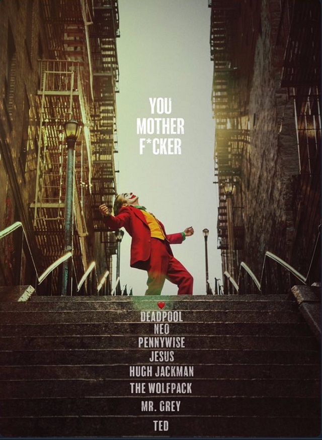 Добавена е и снимка от филма с танцуващия триумфално Жокер, като на стълбите под героя са изписани имената на победените от него филмови персонажи: Дедпул (от „Дедпул 2”), Нео („Матрицата”), Пениуайз („То”), Исус („Страстите Христови”), Глутницата (приятелите от „Последния ергенски запой 2”), Хю Джакман (Логан – героят от „Логан: Върколака“), Мистър Грей („50 нюанса сиво”), Тед („Тед”).