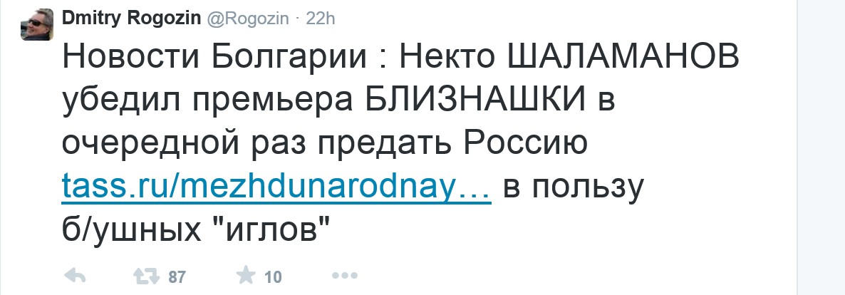 Към нея Рогозин прилага връзка към публикация в руския информационно-аналитичен портал "Евразия", според която София е люто обидена на Москва.