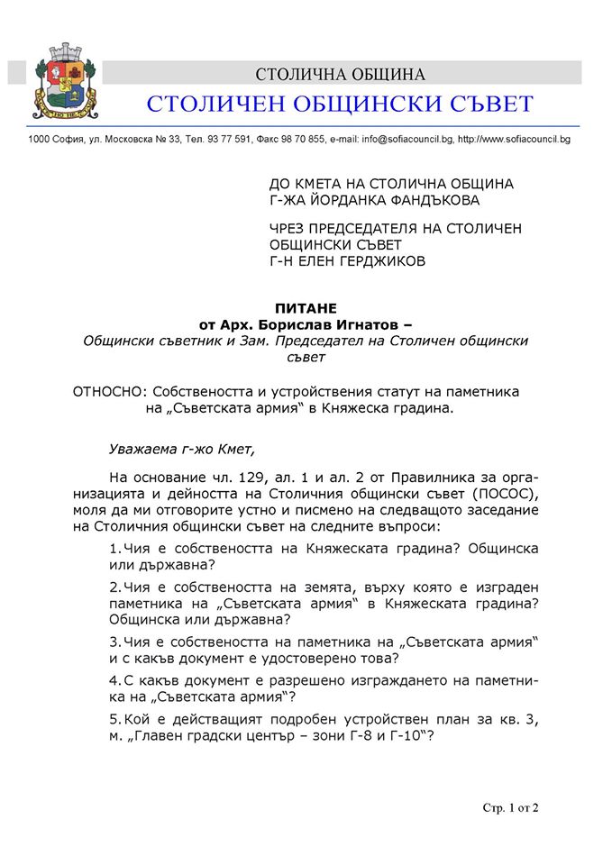 Общинският съветник от "Демократична България" Борислав Игнатов е отправил питане кмета на София чрез шефа на столичния общински съвет относно Паметника на Съветската армия. Въпросите, които Игнатов задава, са няколко, свързани основно със собствеността на земята.