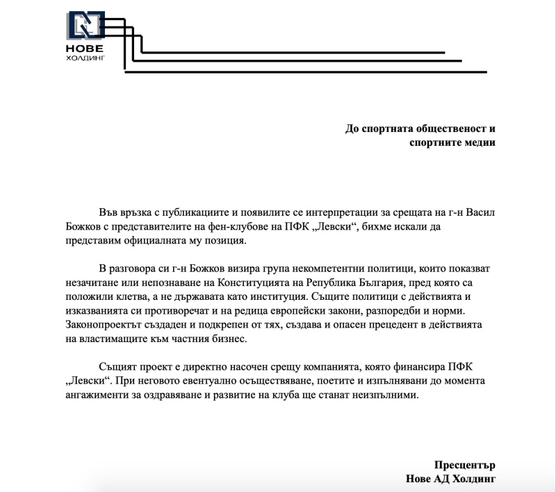 Междувременно "НОВЕ холдинг" излезе с официална позиция за срещата вчера на "Герена".