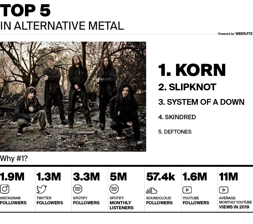Най-яката алтърнатив метъл група за миналата година, дами и господа, е Korn. Ню метъл пионерите са "на хората в устата" от 1993 г., макар фронтменът Джонатан Дейвис да отбелязва, че били по-скоро фънк, отколкото метъл банда. Korn има 3,4 милиона последователи в Spotify, което е, меко казано, забележително за жанра.