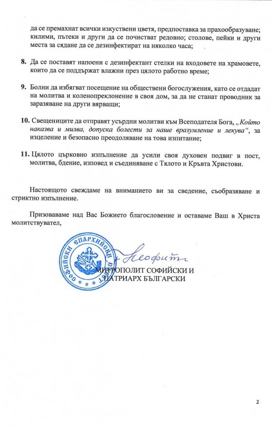 Междувременно патриарх Неофит, който е и Софийски митрополит, изпрати писмо с подробни указания за поведението на църквата, свещениците и вярващите в условия на епидемия от коронавирус. В писмото се потвърждава, че храмовете остават отворени, а свещениците не бива да отказват причастие, защото „светите тайнства не могат да бъдат преносители на зараза и каквато и да е болест, а са лекарство за телесно и душевно изцеление и здраве“.