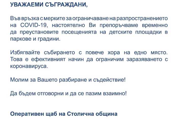 Проверка на Клуб Z показа, че днес Столичната община е разпратила на кметовете на районите унифициран текст, който следва да бъде разпространен и поставен на видими и достъпни места непосредствено до детски и спортни площадки в паркове, градски градини и междублокови пространства.