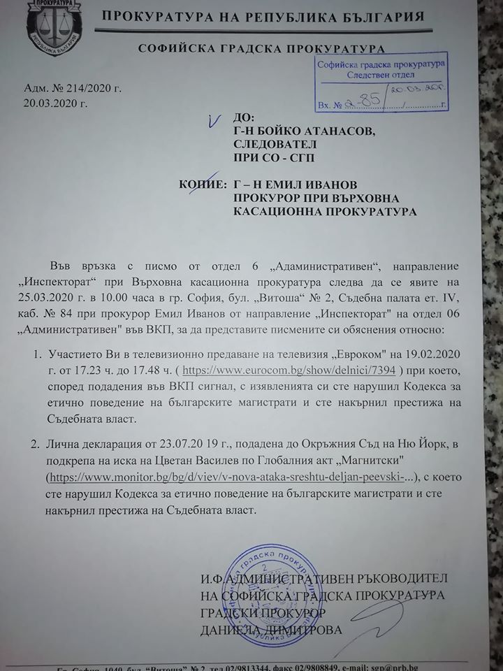 От документа е видно, че той трябва да се яви в Инспектората на ВКП, за да даде писмени обяснения за участието си в предаване на "Евроком" на дата 19 февруари (между 17:23 и 17:48 ч.!). Т.е. прокурорската машина до най-виското й ниво се е задействала за няма и месец - при това напоследък в условията на карантина и извънредно положение.