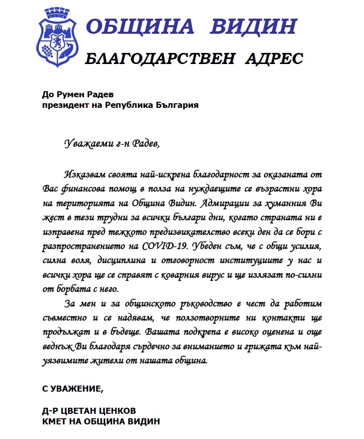 "За разлика от депутати и министри, които възнамеряват да дадат заплатите си към края на извънредното положение, аз го направих в началото. Преди половин месец си дадох заплатата на възрастните хора от Видин. Уважаеми народни представители, за мен дарението е личен акт, ако много държите да се равнявате по президента, има лесно решение – кръгом и бегом към месец март!"