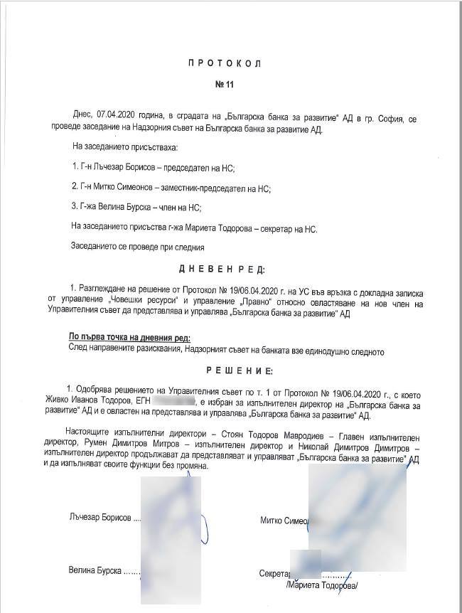 Според решението на наздорния съвет е разгледан протокол от решение на управителния съвет на ББР от 6 април. В него става дума за "овластяване на нов член на УС да представлява и управлява Българска банка за развитие АД".