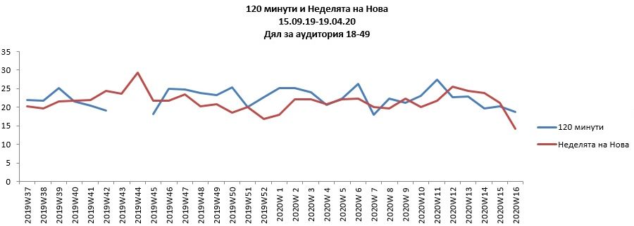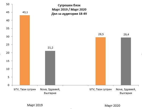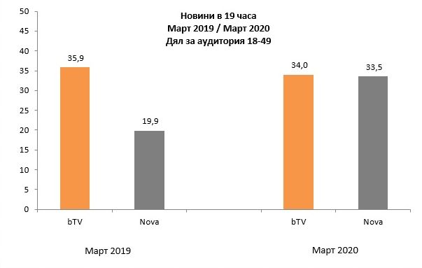 Това обаче трудно обяснява лидерската позиция на новините на бТВ, когато зрителският интерес масово бе насочен към предавания на Нова тв, като Big Brother например. Факт иначе е, че покрай кризата с коронавируса бТВ редуцира излъчванията на някои предавания като MasterChef, спря стартиралия сериал Sunny Beach, а Нова тв не се лиши от развлекателни предавания и сериали. Но това се случва сега.