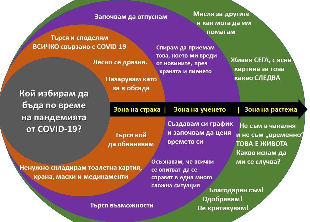 Намирането на ваксина срещу COVID-20 е малко вероятно, затова се препоръчват продължителни по време и неограничени от пространството индивидуални и/или групови тренировки, насочени към създаване на навици за търсене на меродавна информация, разбирането и приемането ѝ като вярна. На приложената картинка от неговия профил се виждат трите възможности за реакция, свързани с пандемията COVID-19. Още по темата – в неговото интервю за бТВ от април т.г.
