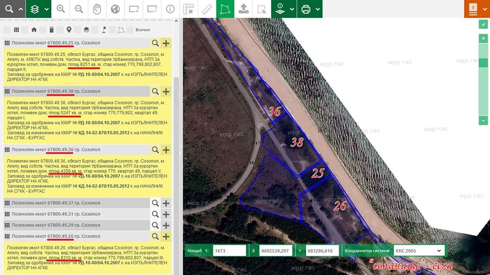 "Поземлени имоти: 67800.49.25 - 8,251 декара; 67800.49.26 - 8,310 декара; 67800.49.36 - 4,358 декара; 67800.49.38 - 5,247 декара", изброява Борисов, като онагледява с извадка от кадастъра имотите, намиращи се по протежението на Шофьорския плаж. Или 26,166 общо.