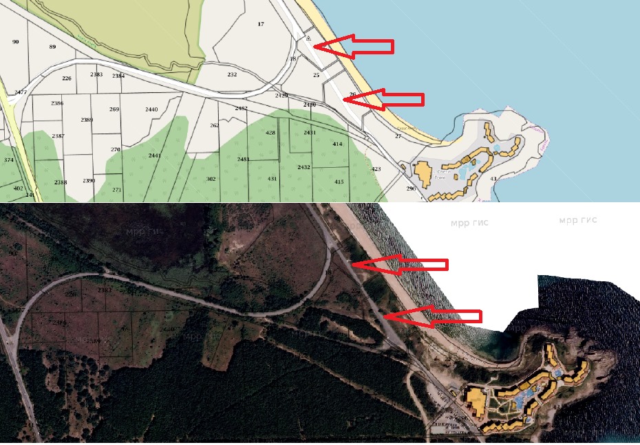 А междувременно, пак от справката в кадастъра е видимо, че старият държавен път покрай плажа е станал... частен и предвиден за строителство, както установява и екологът, днес общински съветник в София от Демократична България - Тома Белев.